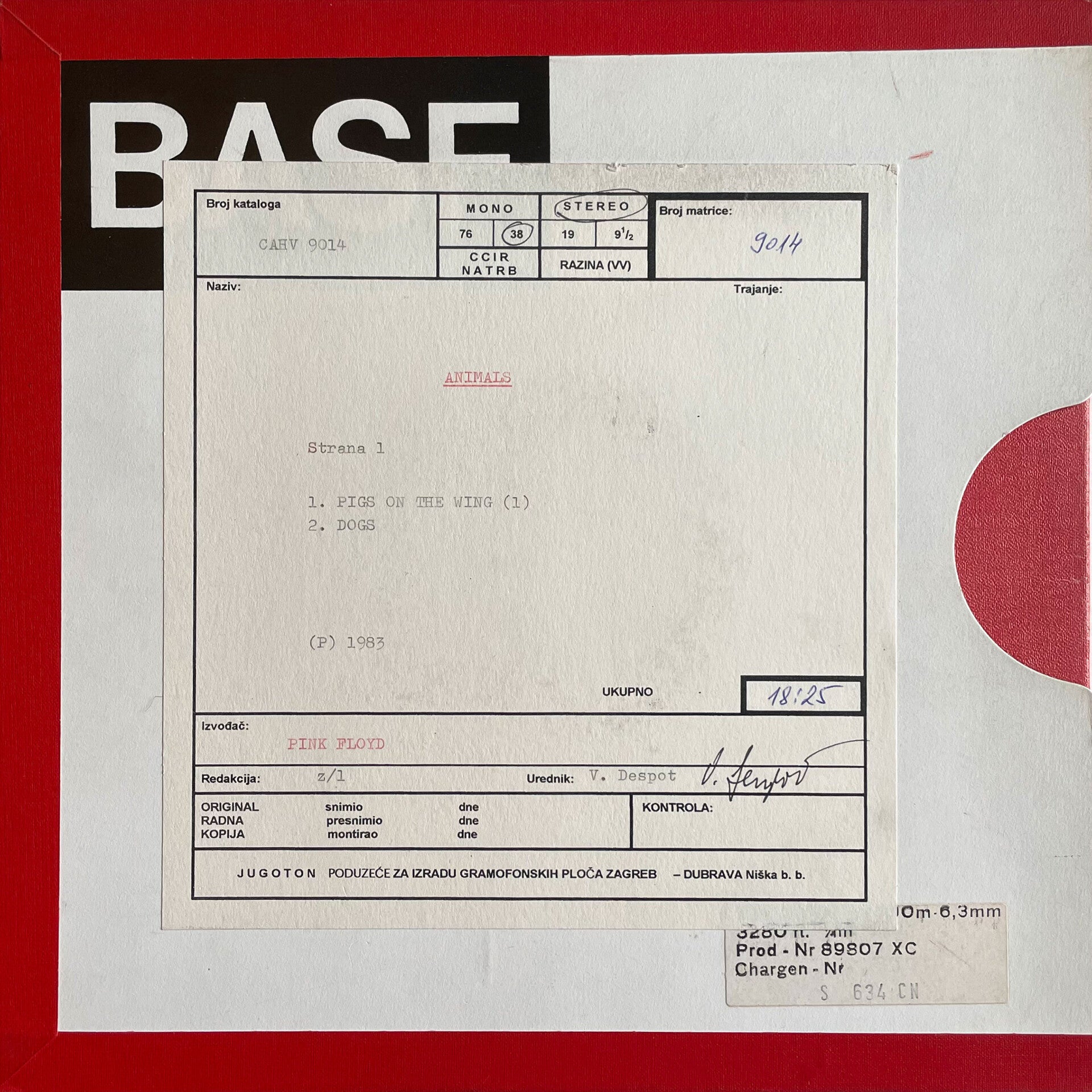 [9134] Yugoslavia Jugoton 1983 5-track 1/4inch Mastertape for the 1983 cassette edition on the Jugoton state label. This was the only time it was issued on cassette in Yugoslavia. The Mastertape is a large BASF tape stickered on both sides with label information and annotations. The first time we ever had such an item and in a beautiful condition (not tested). CAHV 9014. Condition: excellent.