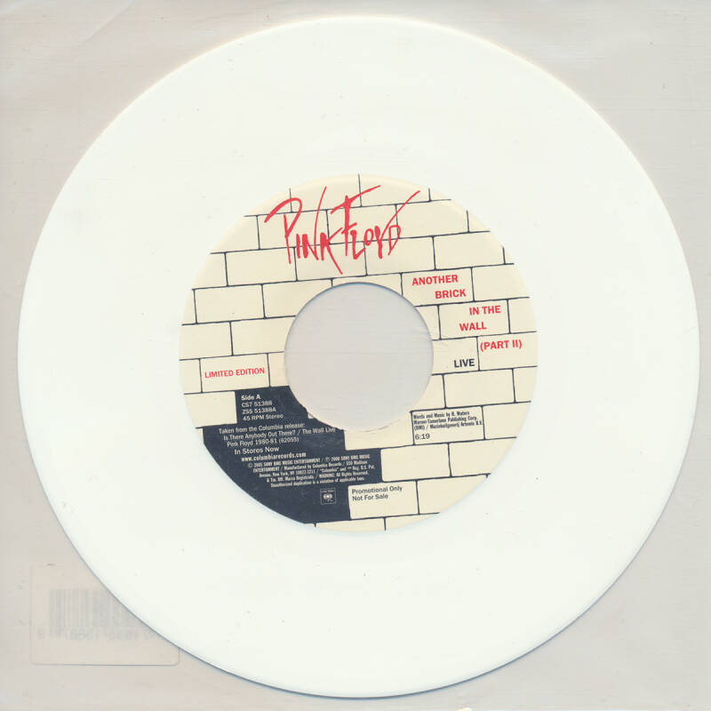 [9319] USA Columbia 2005 promo 2-track white vinyl 7inch in stickered plastic sleeve. Includes: Another Brick In The Wall Part 2 (6m19s live version) / Another Brick In The Wall Part 2 (6m19s live version). Both tracks taken from Is There Anybody Out There? M/NM.