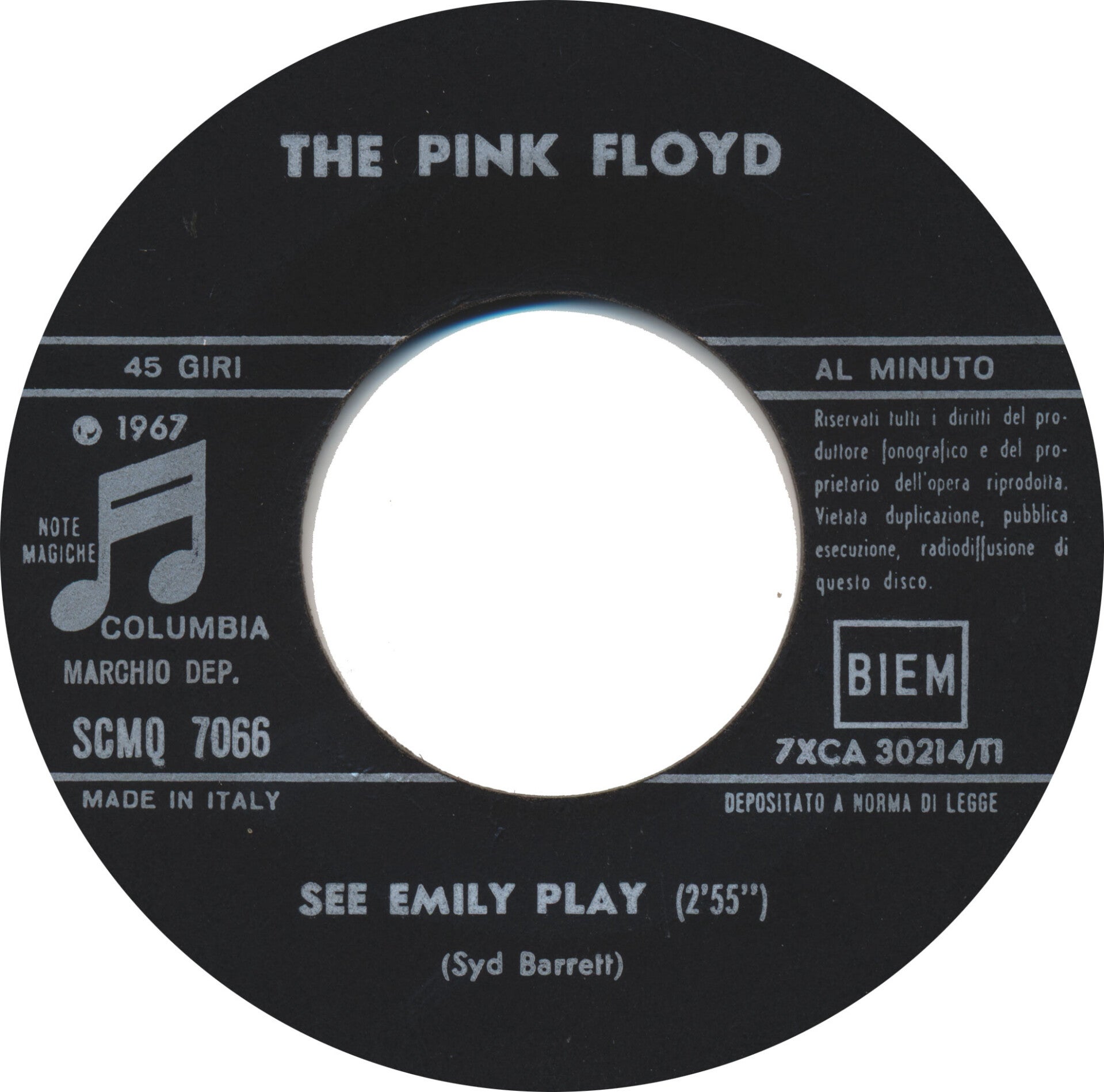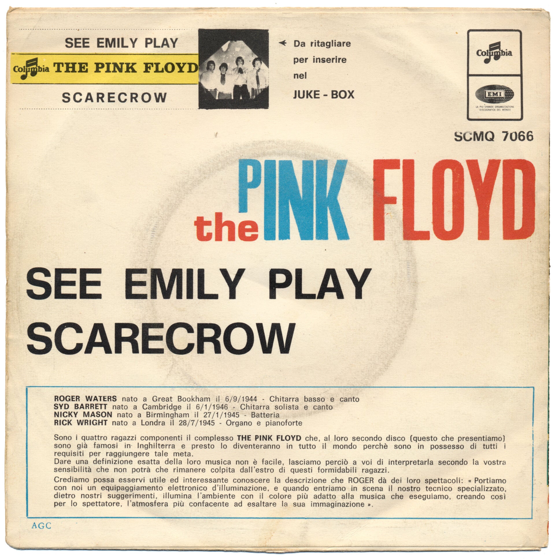 [9183] Italy Columbia 1967 2-track 7inch in picture sleeve. A very clean copy of this classic 1967 release. The single itself is beautiful - shiny vinyl, clean labels, one of the best I've had. The sleeve is way above average with only minor folding and a small repaired tear on the right opening side. A highlight in anyone's collection. Includes: See Emily Play / Scarecrow. SMCQ 7066. VG++/VG+.