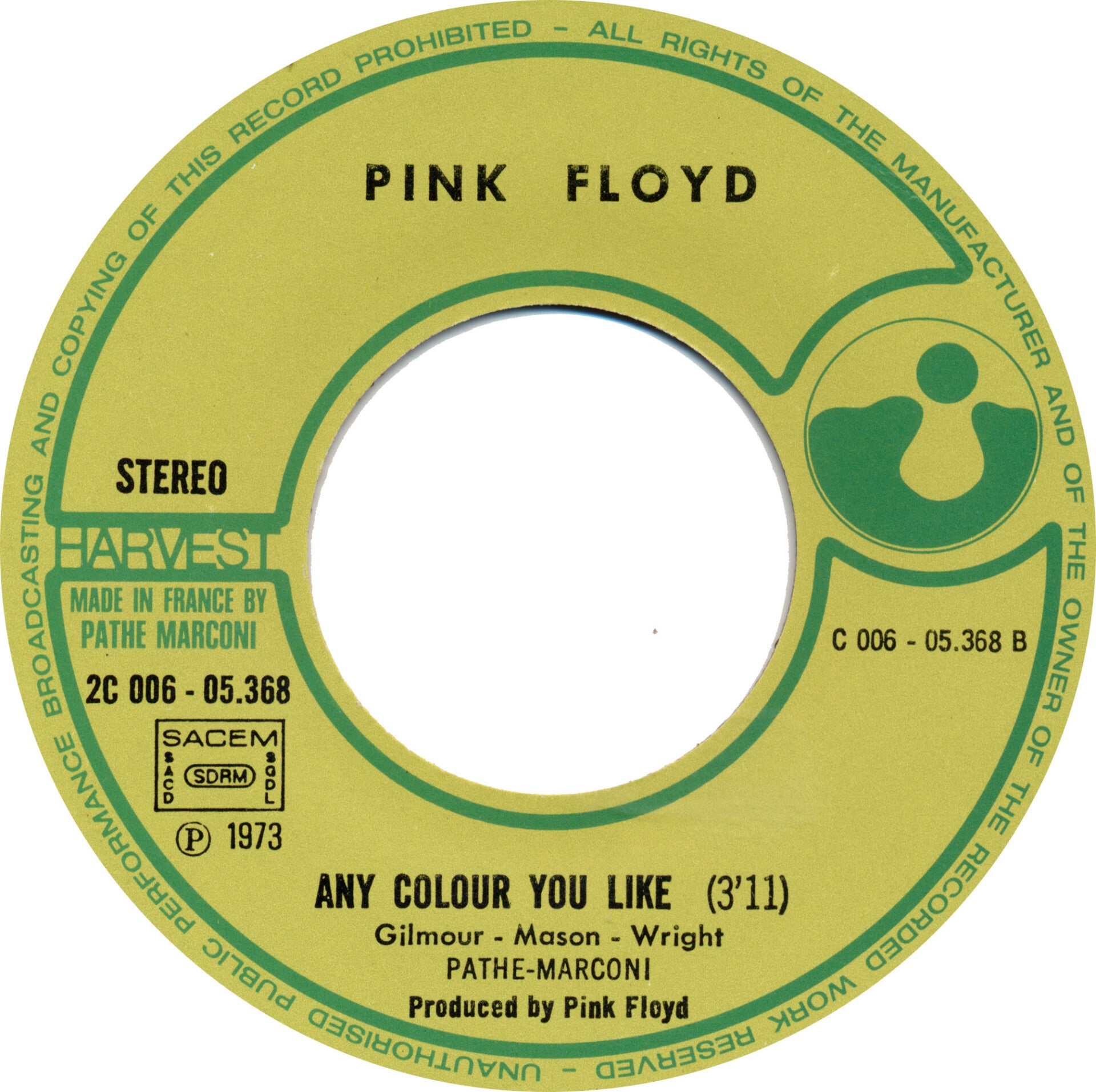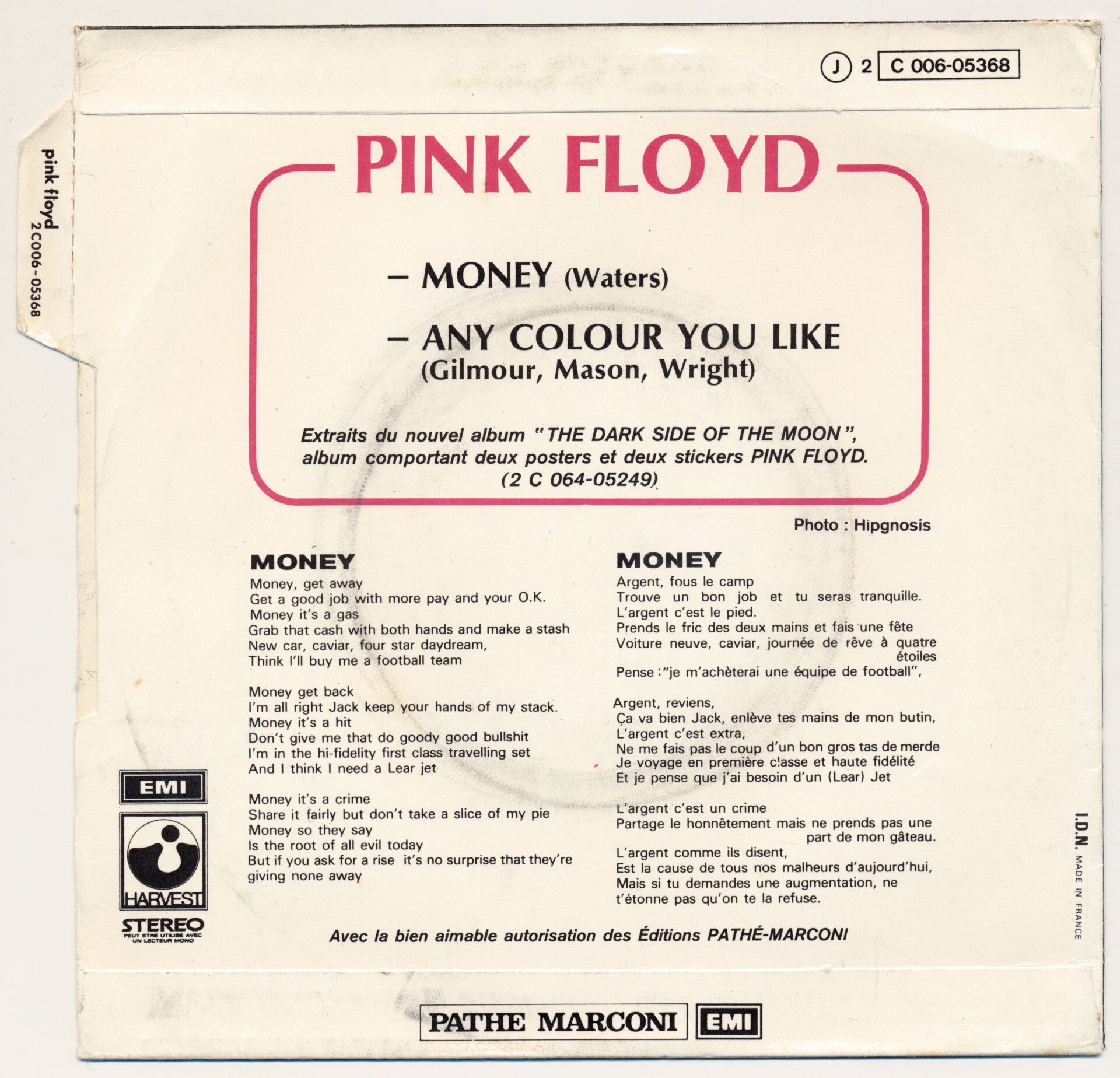 [9224] France Harvest 1973 2-track 7inch in picture sleeve. Clean copy with languette intact. Includes: Money / Any Colour You Like. 2C 006-05368. VG+/VG+.