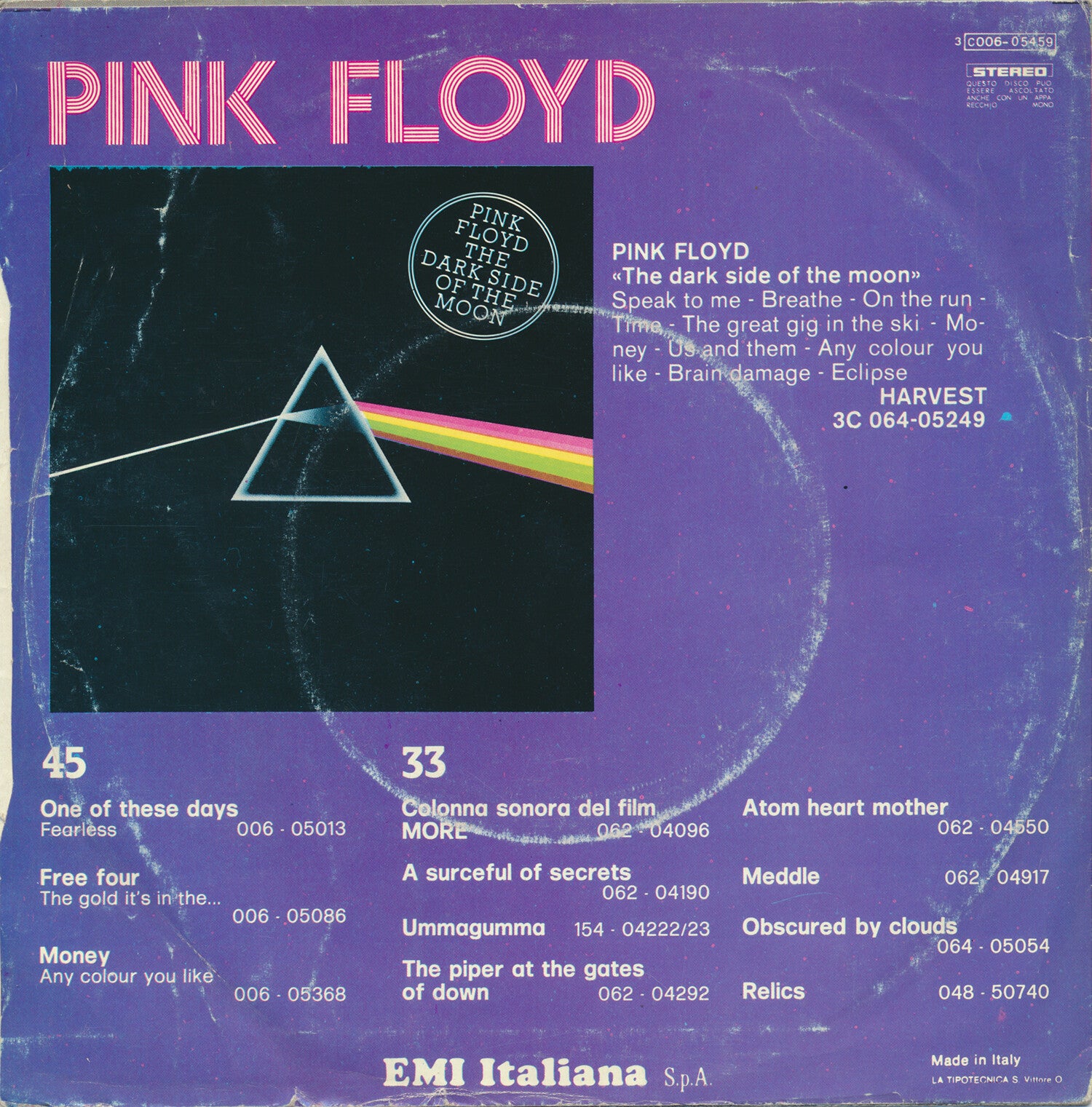 [6964] Italy Harvest 1973 2-track 7inch in picture sleeve. Includes: Point Me At The Sky / Careful With That Axe, Eugene. 3C 006-05459. VG+/VG+.