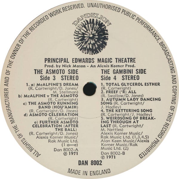 [7062] UK Dandelion Records 1971 6-track LP in gatefold picture sleeve. Produced by Nick Mason. DAN 8002. EX/VG++.