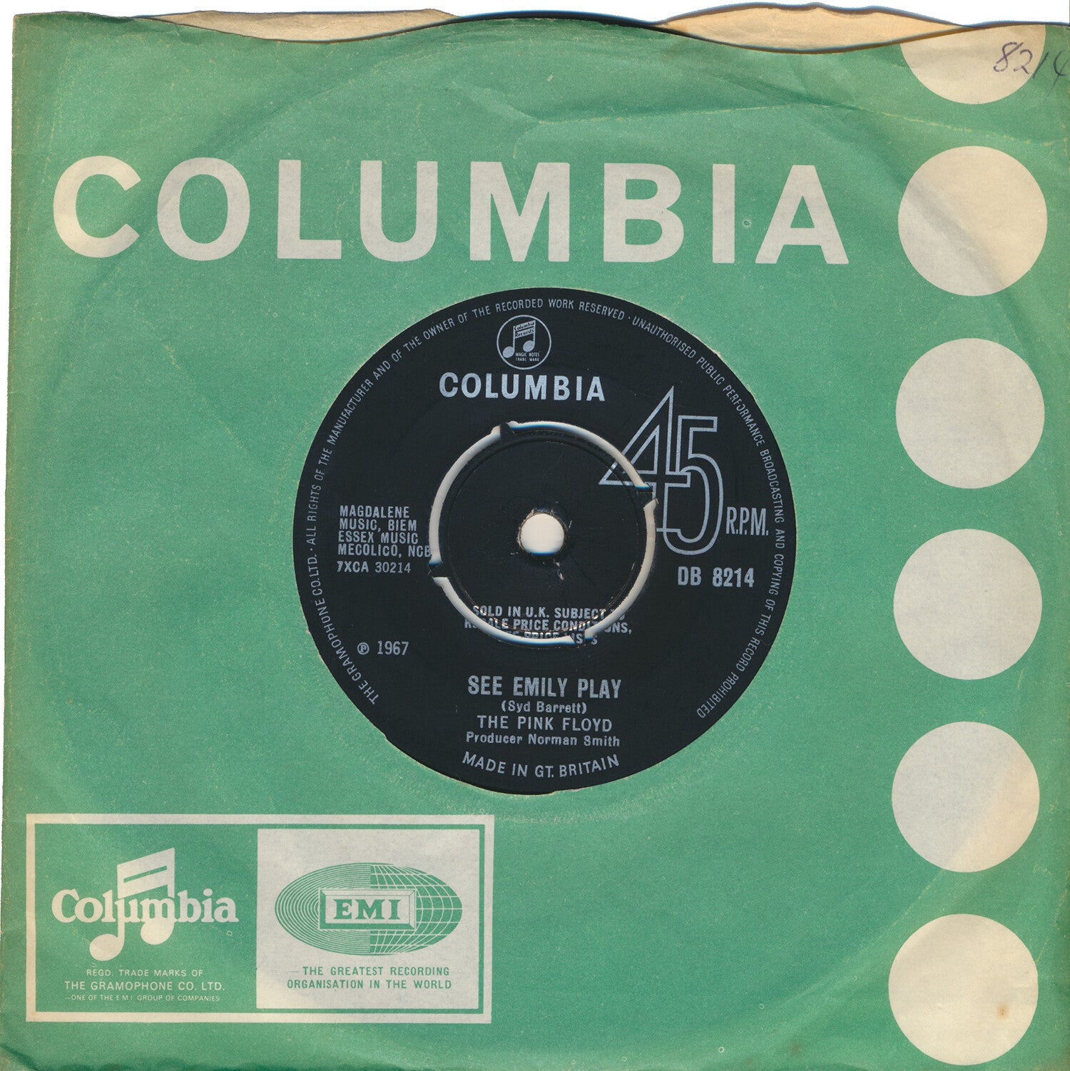 [7159] UK Columbia 1967 2-track press-out centre label 7inch in die-cut company sleeve. This large lettering, most easily recognised by the aligned credits left, was only used for the very first June 1967 runs and were subsequently replaced by a smaller lettering. Roughly two to three percent of know editions have this first label. Record is in a beautiful condition. See Appendix v2.1 of Pink Floyd On Forty-Five (2019) for additional information. Includes: See Emily Play / Scarecrow. DB 8214. VG+/VG+.